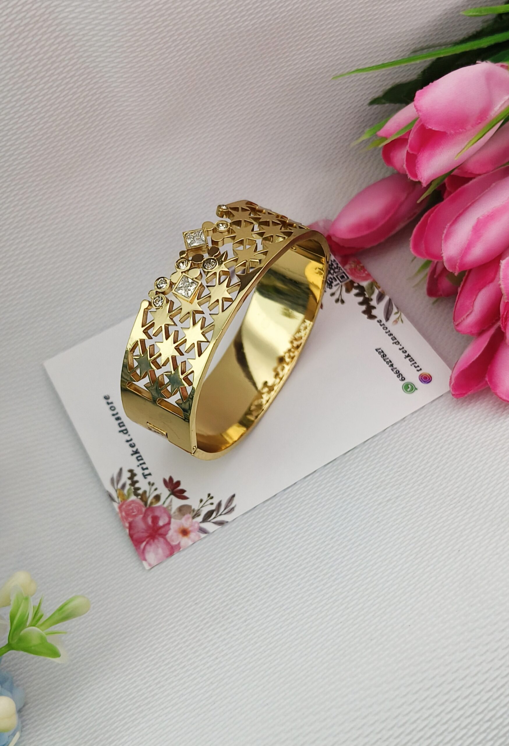 ✨ Elegant gold tone chain kada with detailed cutwork and white stones. 🔓 Openable design ensures comfort and easy wear. 📏 Perfectly fits wrist sizes 2.4 to 2.8.