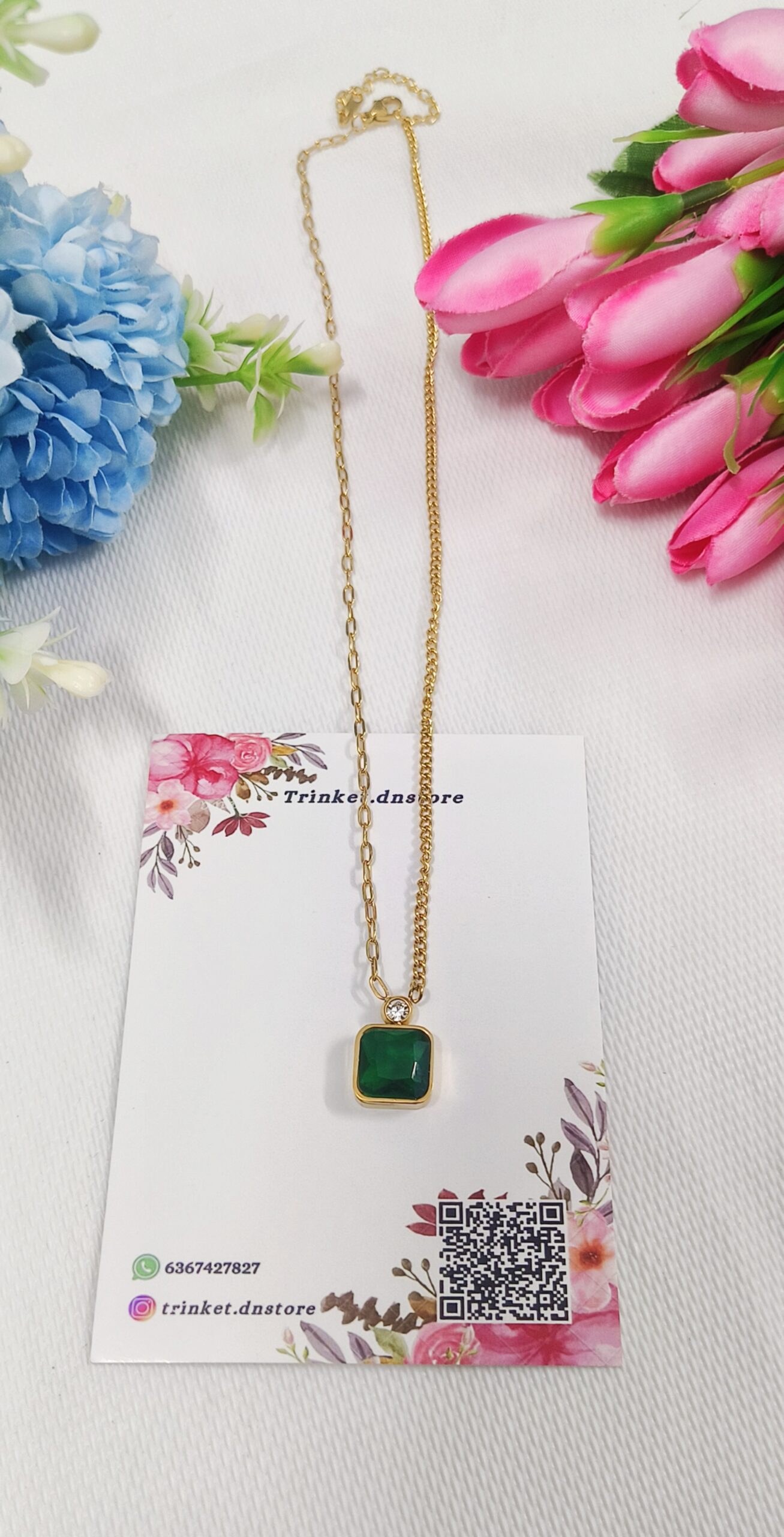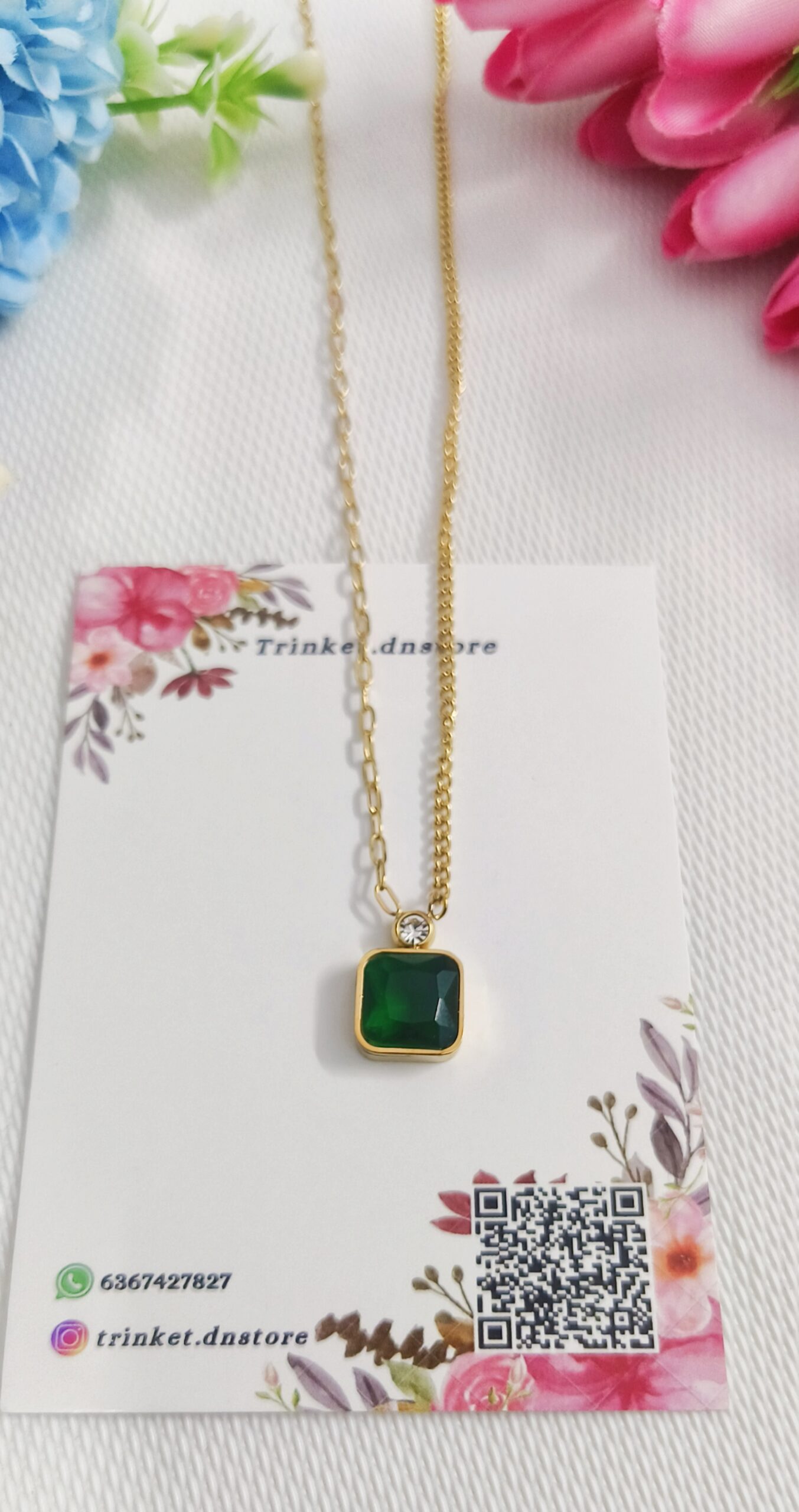 Elegant square-drop pendant chain with a rich green accent, designed for everyday wear and special moments, adding a refined touch to modern and traditional outfits effortlessly.