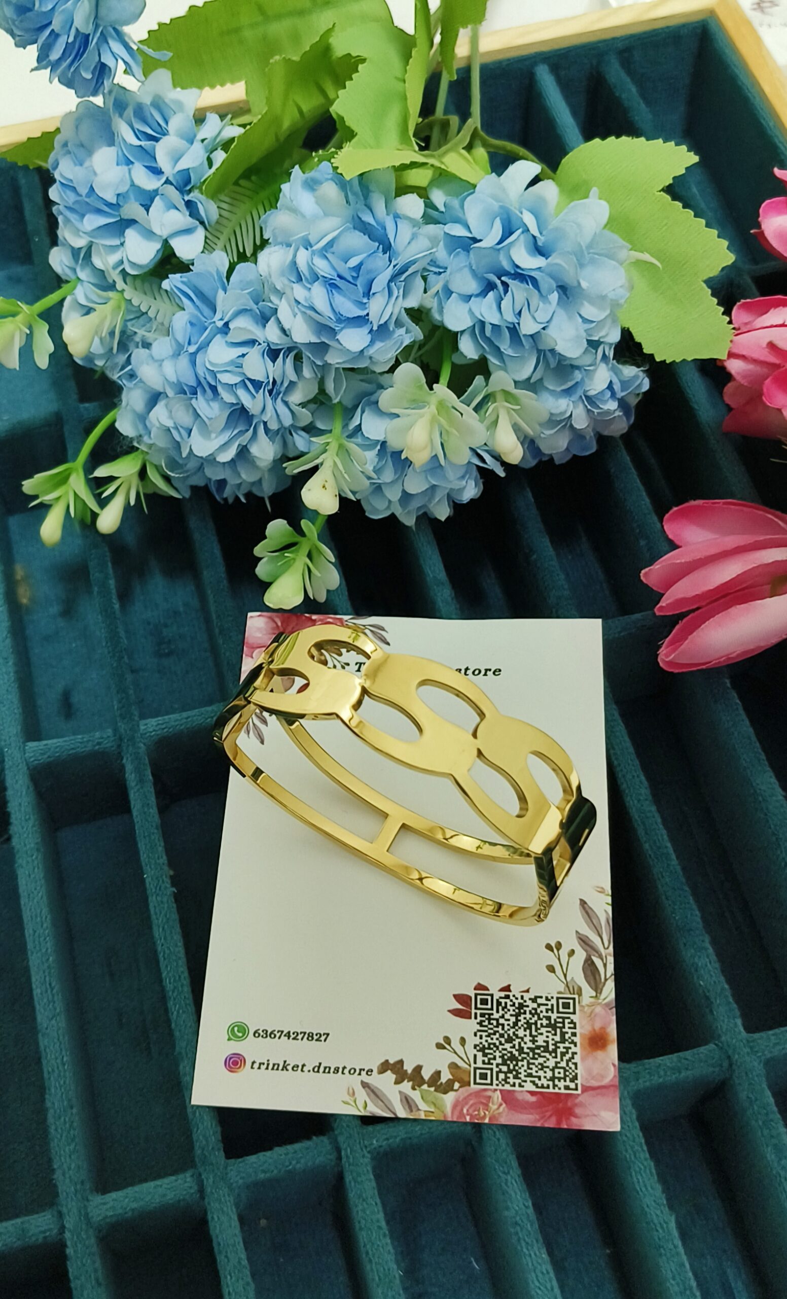 This elegant geometric cut-out bangle features a stylish open-frame design plated in 18K gold. Openable from the side for easy wear, it offers a secure and comfortable fit. Perfectly suited for both daily use and special occasions, adding a modern, classy touch to any outfit. Fits sizes 2.4, 2.6, and 2.8.